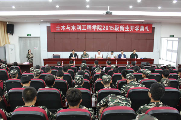 2015�9�8日下午,土木与水利工程学�2015级新生开学典礼在B 区研究生院二楼报告厅隆重举行。学院党委书记马正亮老师、副院长毛明杰老师、副书记王德全老师、副院长崔自治老师、李应海老师、各系系主任、三办一中心主任�2015级新生班主任老师出席了本次典礼。典礼由党委副书记张强老师主持�