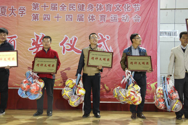 2015年9月30日下午,我校第十届全民健身体育文化节及第四十四届体育运动会闭幕式在校本部C区大学生活动中心举行。校党委副书记赵利宁、王燕昌,宁夏大学副校长王春秀、马应虎、许兴,体育学院院长刘旭东出席了本次大会。学院党委副书记张强老师和学办主任郭利老师代表学院上台领奖。
