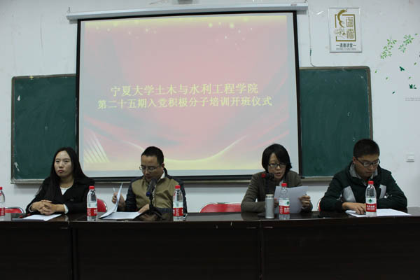 第二十五期入党积极分子培训班开班仪式在工科楼三楼阶梯教室隆重举行。学办主任郭利老师,团委书记王娜老师、2015级辅导员马小凤老师以及兼职辅导员韩东出席了开班仪式,107名思想认识积极的同学也参加了此次开班仪式。
