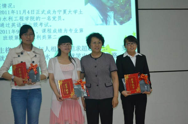 学子良好风貌、引导青年大学生刻苦学习、锐意进取,培养更多、更好的素质过硬、能力出众、道德高尚的高质量人才。学院于5月23日在文科楼一楼报告厅举办以“传递青春正能量 奋发有为成栋梁”为主题的第一届“土水之星”颁奖典礼。宁夏大学党委副书记赵利宁,纪委书记孔斌,院长田军仓,党总支副书记王德全、张强,副院长尹娟、毛明杰、李应海等领导出席了颁奖典礼。