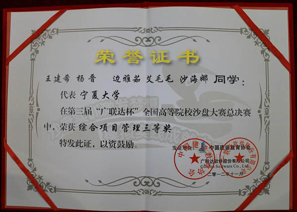 11月23至25日,由中国建设教育协会主办,广联达软件股份有限公司承办,集美大学承办的第三届“广联达杯”全国高等院校工程项目管理沙盘模拟大赛在集美大学诚毅学院举行。六合彩网上投注app派出由张学科老师带队,2009级工程管理专业王建希和2010级工程管理专业杨晋、沙海娜、艾毛毛、边雅茹5名同学组成的代表队参加了比赛,经过1天白热化的角逐,获得综合项目管理三等奖,指导老师张学科获“优秀指导老师”称号。