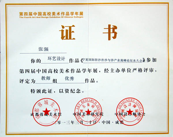 2013年3月,在由中国美术研究院、中国设计师协会、成都蓉城美术馆举办的“第四届中国高校美术作品学年展”中,六合彩网上投注app建筑与规划系教师张强的环艺设计作品“宁夏国际防沙治沙与沙产业高峰论坛永久会址”和摄影作品《小镇》,被评定为教师组优秀作品奖。同时,这两幅作品由第四届学年展组委会推荐,入编大型年度出版物《中国创意设计年鉴》正式出版。