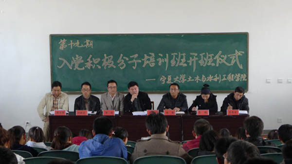 在党的十八大即将胜利召开之际,为进一步贯彻落实宁夏大学第六次党代会精神,不断学院推进“金种子工程”,2012年11月1日,六合彩网上投注app第十九期入党积极分子培训班开班仪式在工科楼三阶隆重举行。学院党总支书记马正亮,副书记张强,学办主任郭利及全体辅导员老师出席了本次开班仪式。仪式由辅导员马姣老师主持。