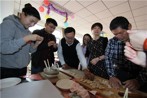 中午11点,学院党政领导来到各系活动室,与各系教职工一起准备食材、布置场地,准备包饺子活动。之后,各系教职工纷纷到齐,踊跃参加新年活动。每位在场教职工各有分工,擀面皮、包饺子的迅速有序展开,大家迫不及待地挽起了衣袖大干起来。窗外寒意袭人,屋内暖意融融。一会儿功夫,在大家齐心协力下,饺子很快都包出来了,在大家欢喜声中,热气腾腾的饺子已经出锅,教职工们兴高采烈端饺子、拌调料,纷纷露出笑容并与自己的作品合影留念,高兴地品尝自己的劳动成果。