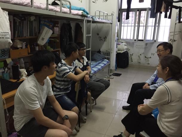范教授先走进15#公寓的学生活动室,与正在筹备学生活动的团委学生会干部进行了亲切交谈。随后,范教授来到学生宿舍,与学生深入交谈,亲切询问了同学们对于宿舍同学关系、大学生活规划和今后就业发展规划等一系列问题的看法,并查看了宿舍卫生状况。在与同学们的交流过程中,他勉励同学们要将自己的发展定位定的高一些,要树立远大理想,为宁夏大学的发展做出贡献。范教授还嘱咐大家要调整安排好自己的学习和生活,积极努力,向着自己理想的目标不懈奋斗。最后,范教授还听取了公寓文化上墙、宿舍信息牌、党员学干亮身份、宿舍卫生评比等宿区管理工作的汇报,并对学院在宿区管理方面做出了努力给予了高度肯定。