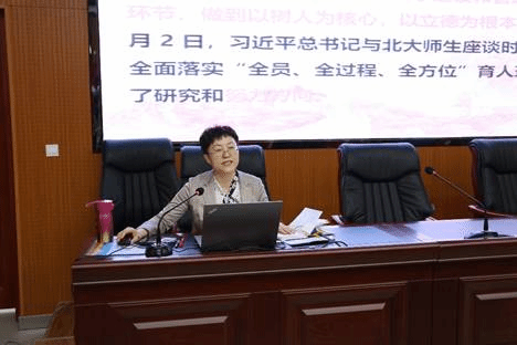 尹娟从“新时代”、“立德树人”、“三全育人”、“课程思政”的内涵及其相互之间的关系、党史学习教育的重大意义等方面进行了详细的讲授。解读了我国新时代高等教育的育人新格局、新理念。她强调,教师是红色基因的传播者,首先得学好党史,才能更好的教育我们的青年学生。要教育青年学生不忘历史,铭记英雄为今天的幸福生活不惜牺牲自己的大无畏的精神,要将“学史力行”转化为刻苦学习的动力,努力学好科学文化知识,担负起下一个百年建设的历史重任。