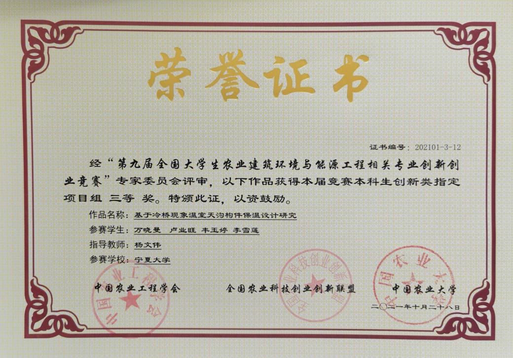 杨文伟教授指导,万晓曼等四名同学参赛的本科生创新类指定项目《基于冷桥现象温室天沟构件保温设计研究》获得三等奖;由六合彩下注平台