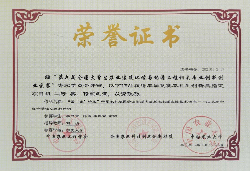 刘娟副教授指导,李昱甫等四位同学参赛的本科生创新类指定项目《“蓄‘光’待发”宁夏农村地区经济型近零能耗农宅适宜性技术研究》获得二等奖;由六合彩下注平台