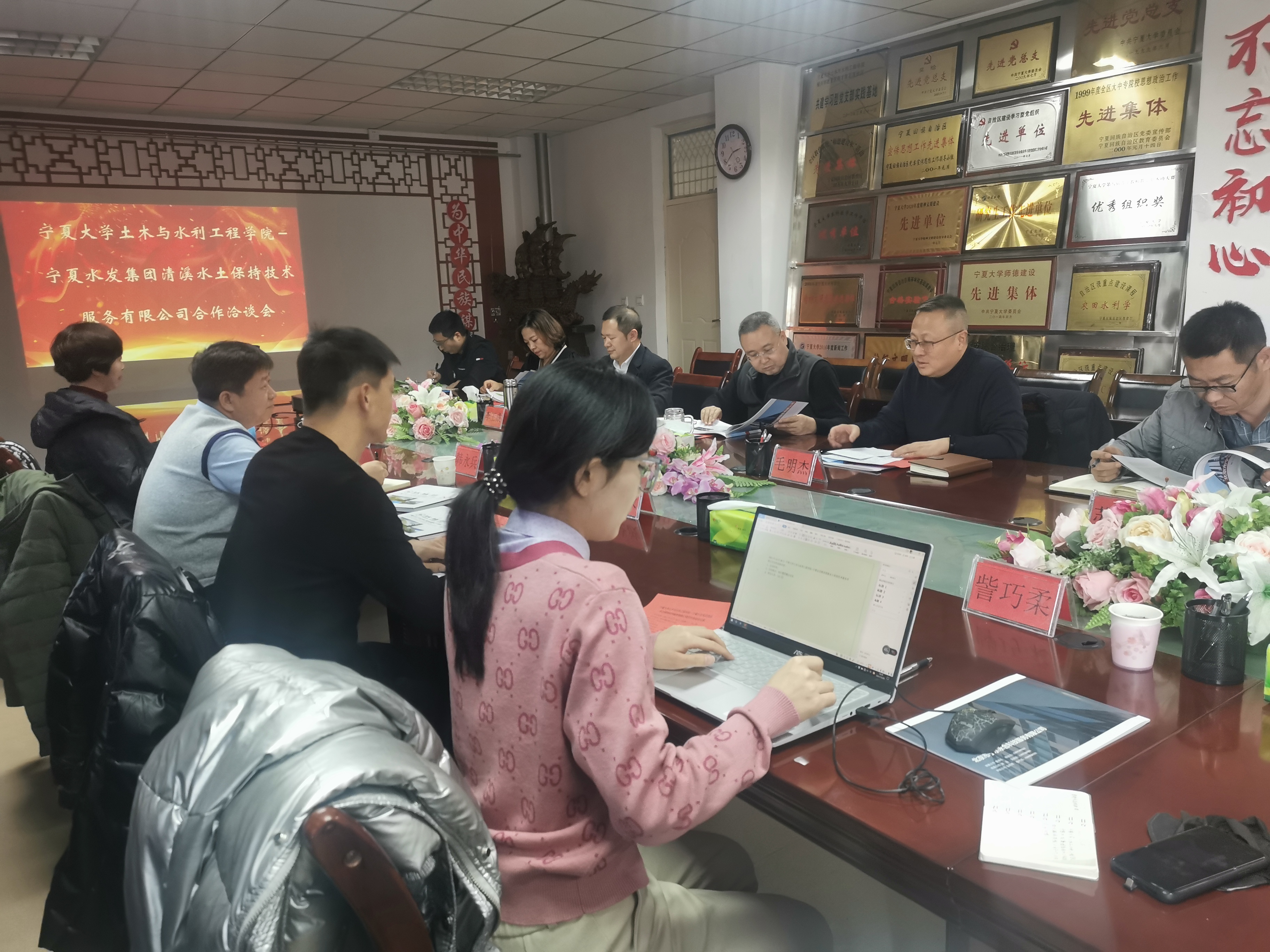 吴晓波副总经理介绍了宁夏水发集团为宁夏国有资本运营集团有限责任公司全资子公司,是宁夏首家水管体制改革市场化运营服务试点企业。宁夏清溪水土保持技术服务有限公司于2001年2月12日经申请注册成立,主营业务为水保方案编制;水保监理及监测技术服务;水保设施验收报告编制及咨询服务等;涉及了水利、电力、交通运输、煤炭、化工等多个行业领域。公司内设5个部门、一个子公司—宁水永合科技有限公司。双方在水土保持技术服务与科研方面有着很大的合作空间,大力推进校企合作战略,将进一步促进该公司产业基础的升级、加快人力资源结构的调整。希望通过双方的共同努力,优势互补、产研学结合,充分展开各种合作,把合作推向新的高度,达到双方互利共赢。