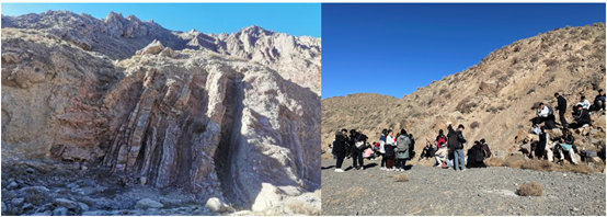 首先前往第一站是在黑山峡出口,位于甘肃与宁夏交界的峡谷地区,连接甘肃、宁夏两省区,全长约71公里,是黄河上游最后的峡谷,也是黄河上游河段中最后一个尚未开发的较长的河段,蕴藏着丰富的水力资源。大柳树坝址下游的冰沟,冰沟是位于宁夏中卫市大柳树河段的一个大型冲沟,地质条件多为寒武纪变质岩、泥盆纪粉砂岩及淡红色的砂砾岩、石炭纪页岩粉砂岩等构成。通过实地观摩,使同学们了解了各种地质构造如节理、裂隙以及断层、褶皱等各类工程地质现象。此外,同学们还掌握了地质罗盘的用法,动手实测了岩层的走向、倾向、倾角。