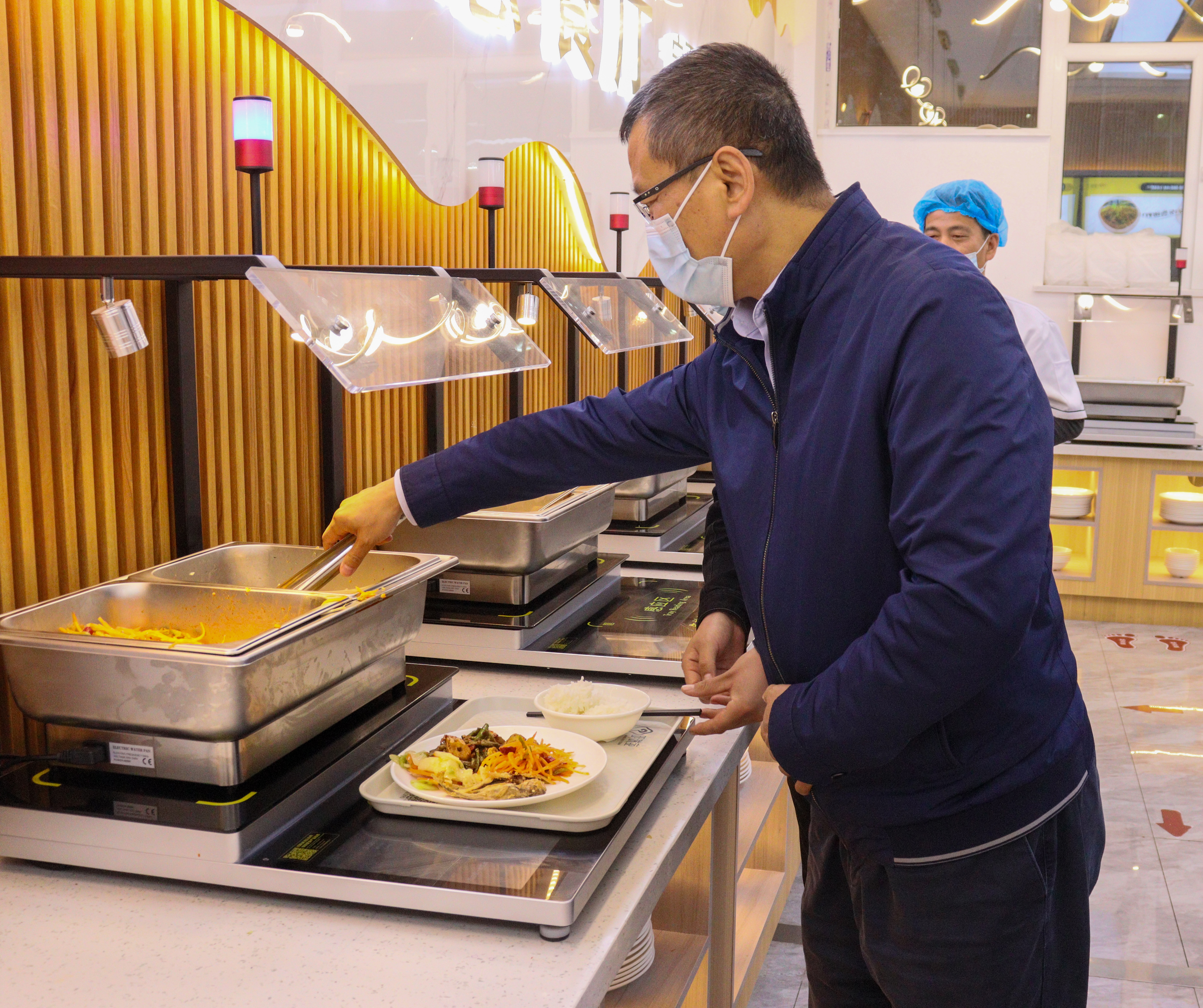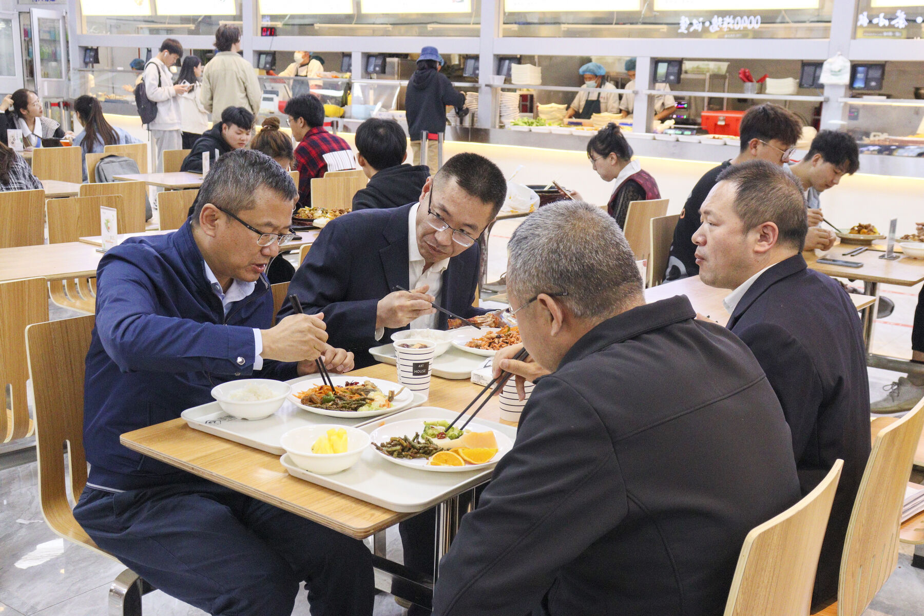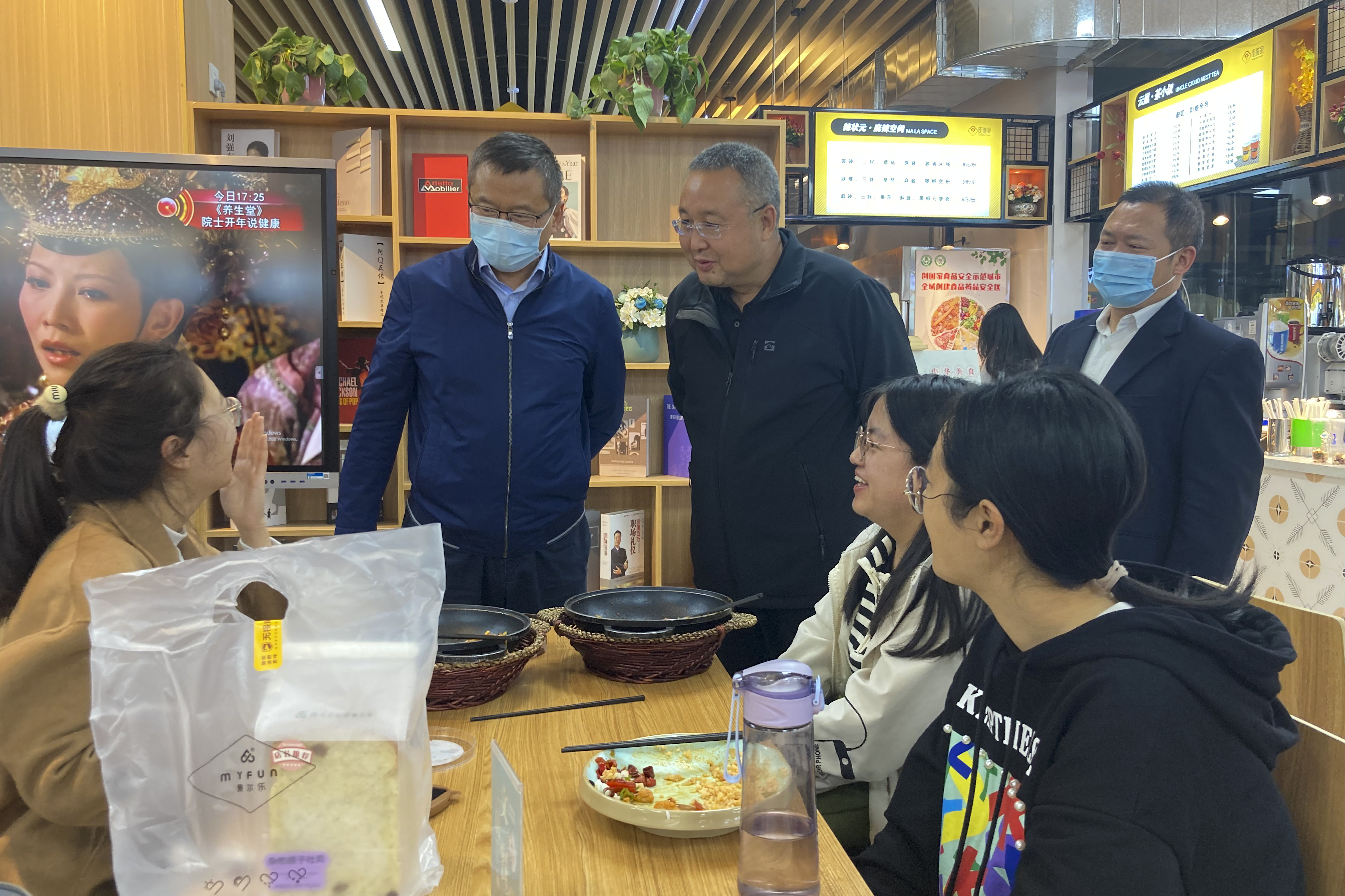 王忠静与食堂管理与服务人员了解了食堂的运作情况、菜色搭配和食品安全问题,查看了操作间、洗菜池和存货间。随后,与就餐学生进行了亲切交谈,深入了解了学生对就餐环境、饭菜质量、饭菜价格、食品卫生、饮食习惯以及对食堂管理等方面的意见建议。与学生坐在一起、吃在一起、交流在一起,切实把思想政治工作做到学生的心坎上。