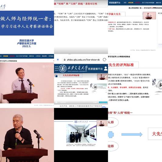 组织教师于5月25日下午16:30—18:00在线参加了国家教学名师西安交通大学卢黎歌教授的《西北联盟在线报告开讲》报告,题目为:做“经师”与“人师”统一者——学习习近平总书记在中国人民大学考察时的重要讲话体会。