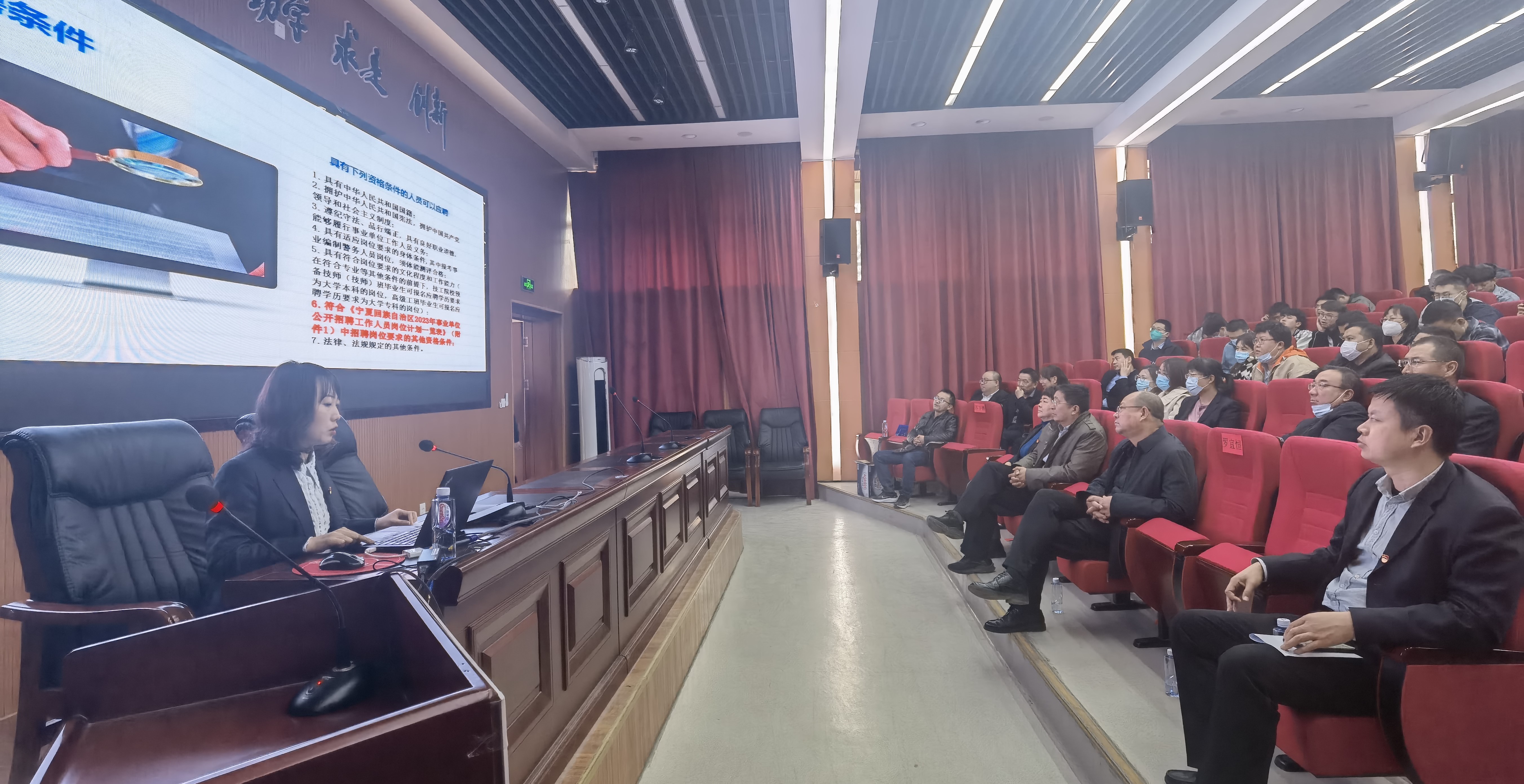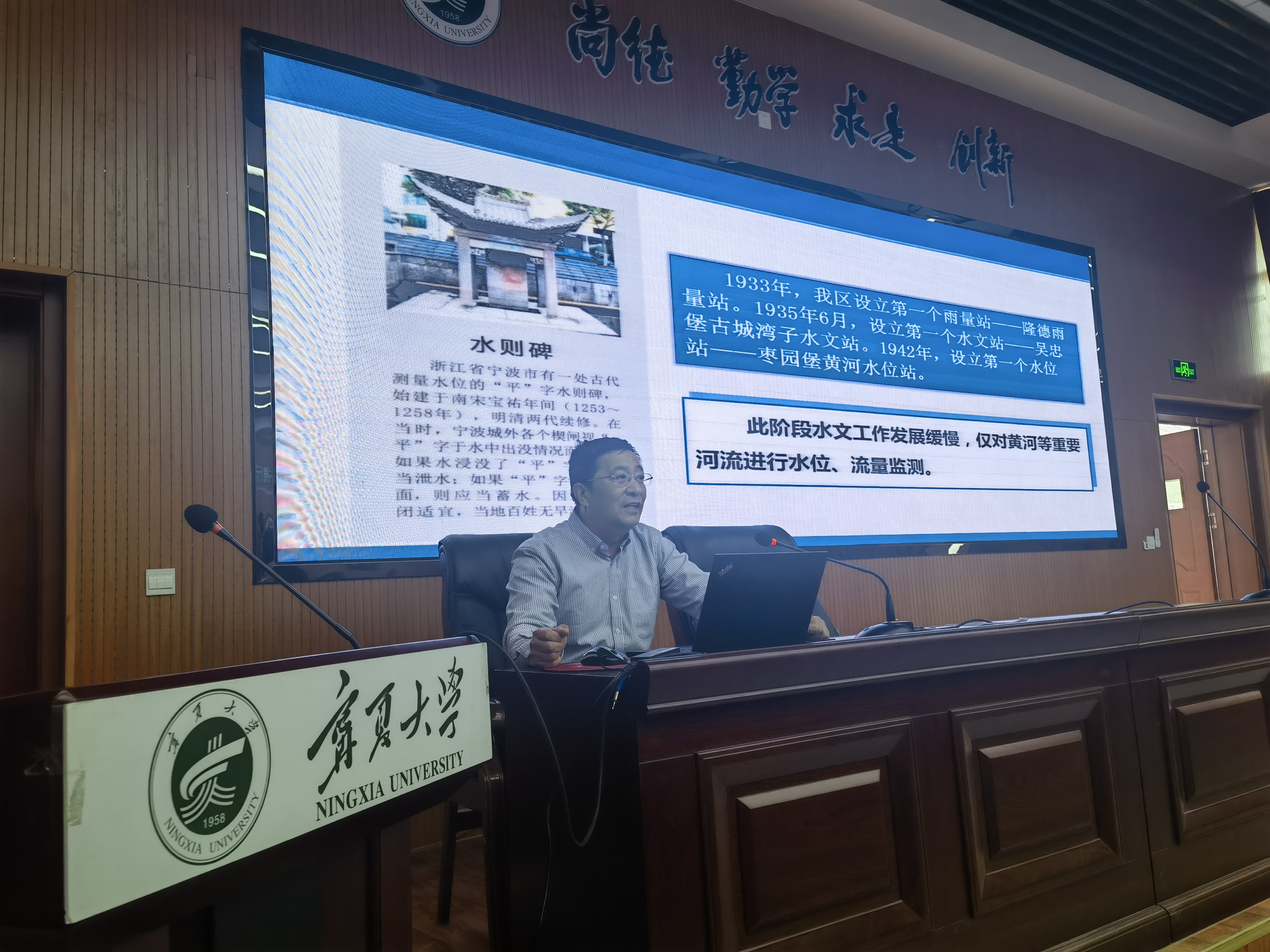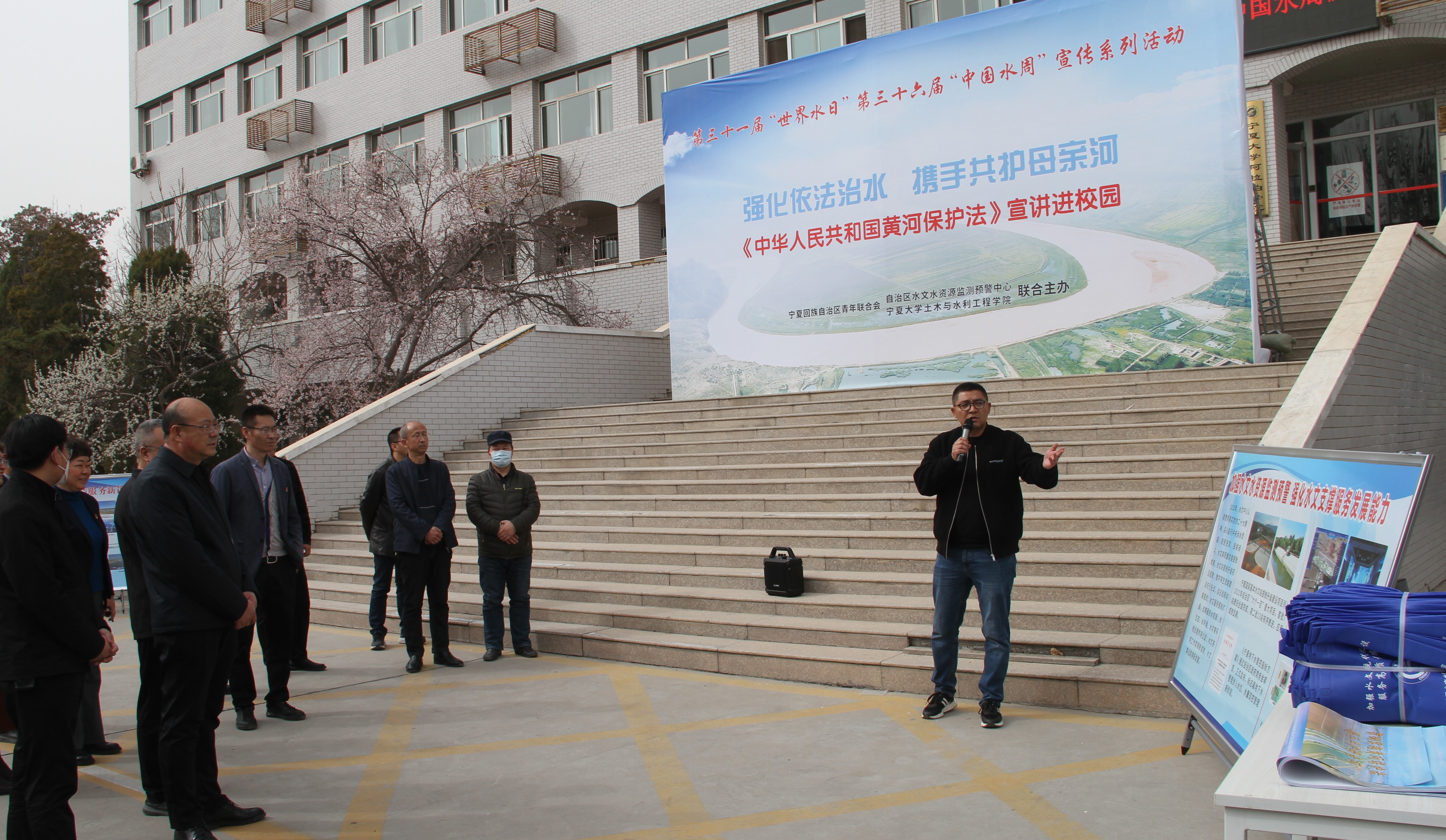 活动开幕式上,陈晓敏书记、侯树增书记、李海波副主任分别致辞,杜历主任宣布活动开始。宣讲人员通过宣传展板、发放彩页、短视频和讲座等多种方式向师生宣传节约用水、水生态保护和 “关爱母亲河”等方面的内容。杜历作了题为《宁夏水文发展历史及水文现代化建设》的报告,水文中心监察室主任陈雪作了题为《中华人民共和国黄河保护法》的宣讲,组织人事科科长李笑翔对宁夏事业单位人才招聘政策和水文中心人才招聘情况进行了解读。