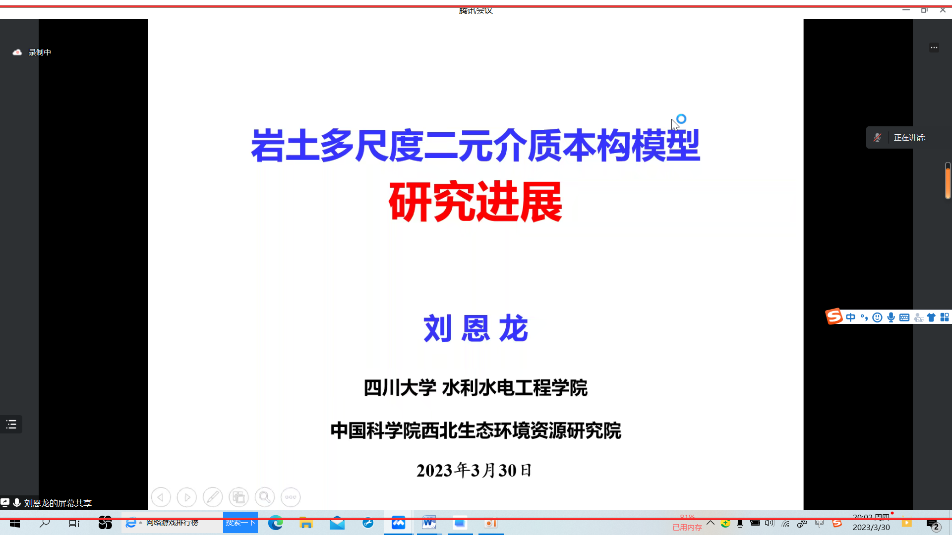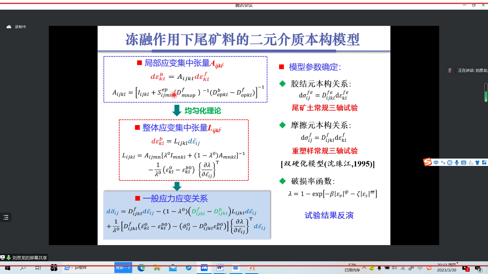 邀请,四川大学水利水电学院刘恩龙教授为我校师生做题目为“岩土多尺度二元介质本构模型研究进展”的线上学术报告。报告由刘海峰副院长主持,六合彩网上投注app和物理与电子电气工程学院师生共100余人参加了报告会。