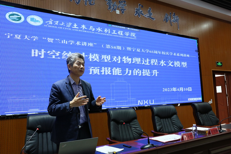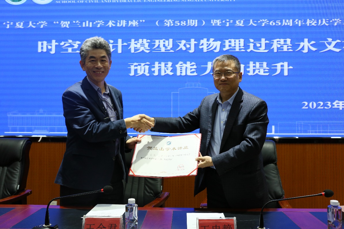 2023年4月10日下午,在宁夏大学65周年学术校庆之际,墨尔本大学教授、清华大学杰出访问教授王全君应邀为学院师生及宁夏气象局、宁夏水文水资源监测预警中心、宁夏水利科学研究院等十多家单位的科技工作者共300余人以线上线下方式做了宁夏大学第58期“贺兰山学术讲座”首场报告,也拉开了本次学术校庆的序幕。报告会由学院党委副书记尹娟主持,会前王忠静副校长向王全君教授颁发了“贺兰山学术讲座”证书与纪念册。