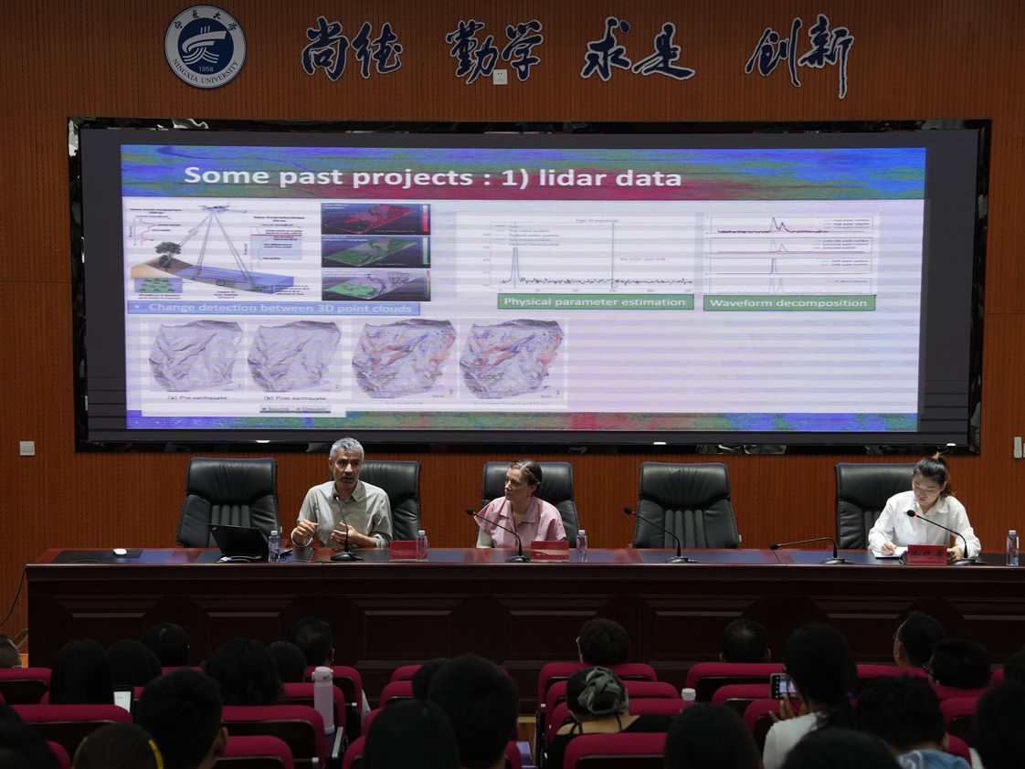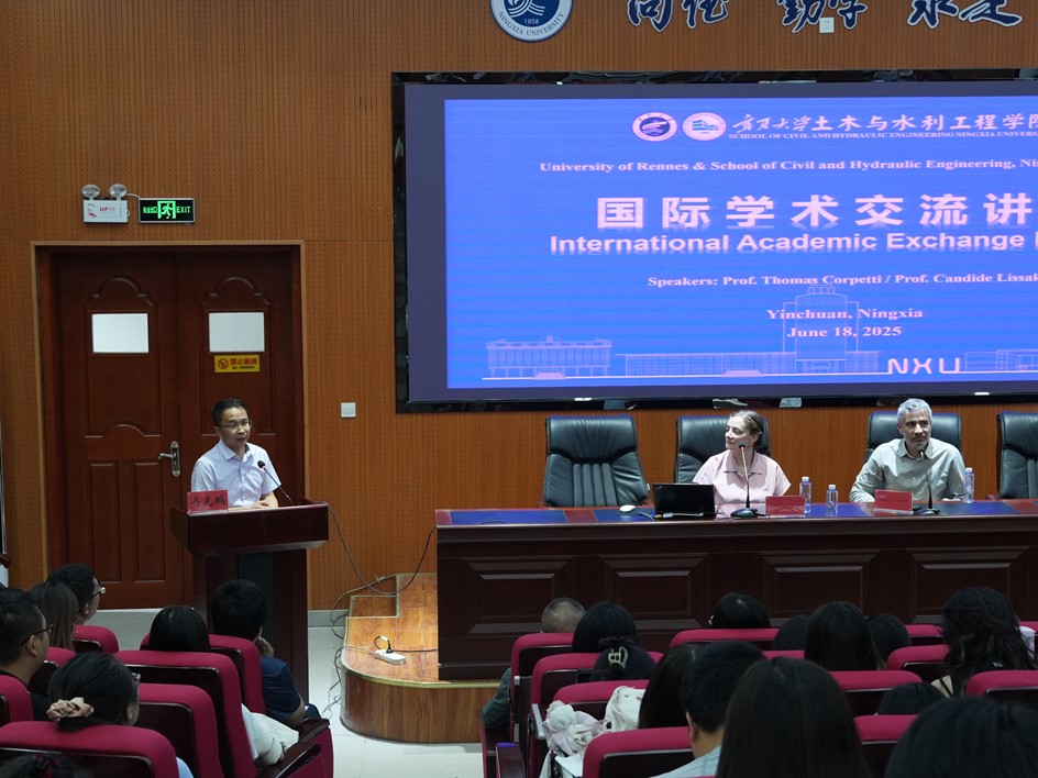 2025�6�18日,法国国家科学研究中心环境遥感研究室主任Thomas Corpetti教授与法国雷恩大学Candide Lissak教授应邀到访宁夏大学土木与水利工程学院,围绕水文遥感、智慧水利与环境健康风险评估等主题开展学术交流,分享最新研究成果。Thomas Corpetti教授和Candide Lissak教授分别为学院师生作题为《Urban Air Temperature Estimation with Neural Networks Pretrained on Physical Models》、《Remote Sensing Application in Risk and Health Exposure Assessment》的学术报告。学院党总支书记尹娟、副院长李王成及水利系教师、学�100余人参加。报告会由冯克鹏教授主持�