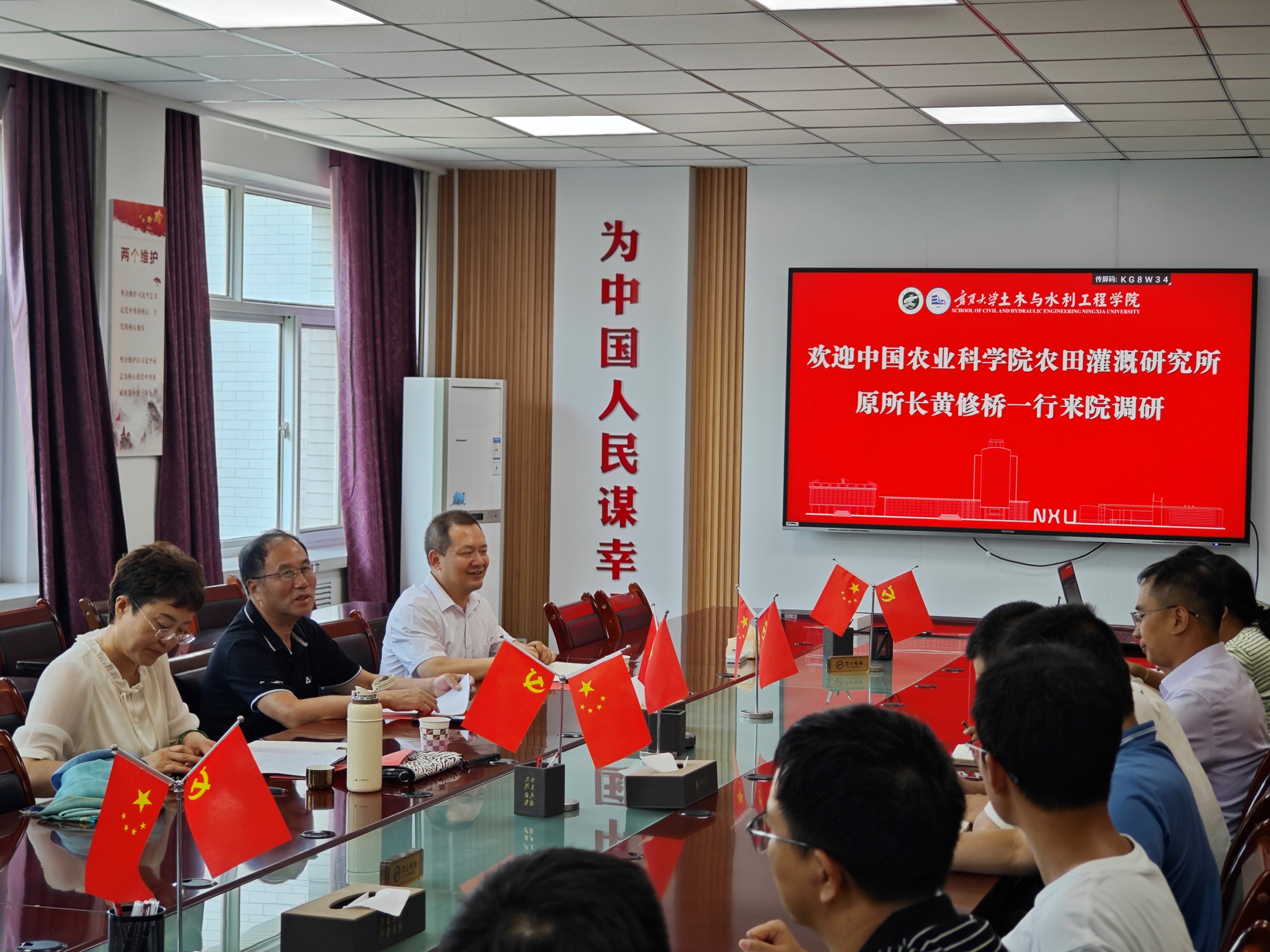 2025�7�9日,中国农业科学院农田灌溉所原所长黄修桥一行应邀访问宁夏大学土木与水利工程学院,双方于知行楼415召开了座谈交流会,学院党总支书记尹娟、副院长李王成、水利系主任王炳亮、水利系副主任李超超、水利系党支部书记吴璞伟,以及各方向负责人和教师代表参加了座谈会。座谈会议由副院长李王成主持�