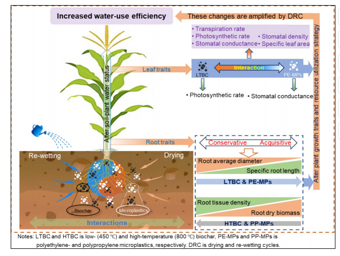 低温生物炭(LTBC�450℃热解)在微塑料污染土壤中能通过交互作用提高玉米的水分利用效率(WUE);而高温生物炭(HTBC�800℃热解)则产生不利影响,尤其在添加聚丙烯微塑料(PP-MPs)的土壤中�