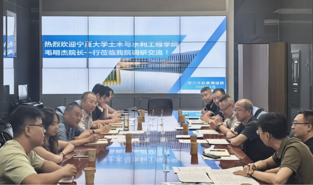 2025�8�8日,宁夏大学土木与水利工程学院院长毛明杰率队赴银川市勘察测绘院开展深度交流座谈,宁夏测绘院院长董军率领导班子成员接待毛明杰院长一行,会议在银川市自然资源局一号会议室举行,双方聚焦人才培养、技术协作与产学研融合,共绘校企合作发展蓝图�