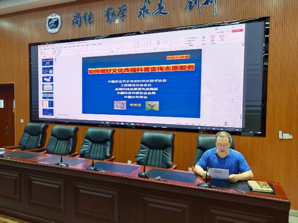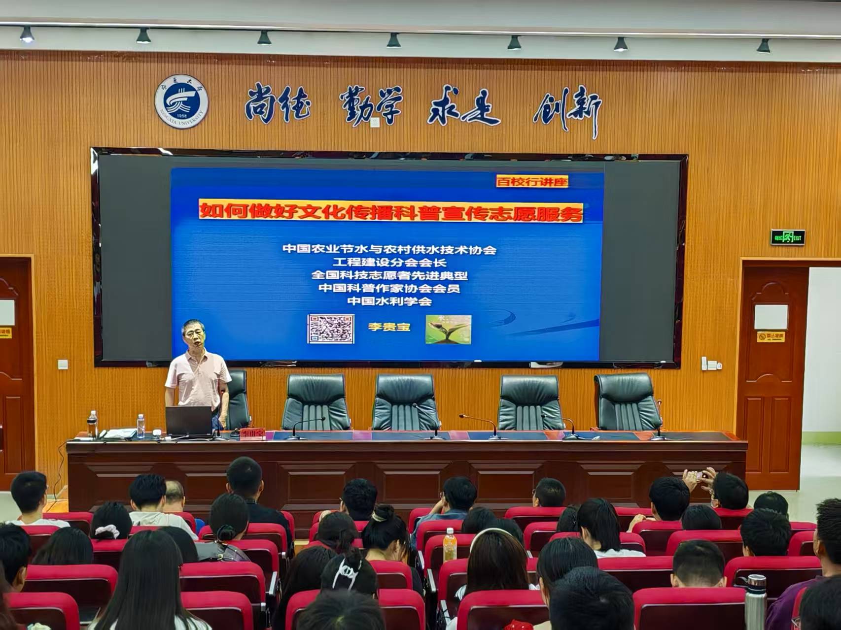 为深入挖掘黄河文化、灌溉文明与区域水治理经验,推动水文化教育与河湖保护志愿服务深度融合,提高师生科普知识能力和志愿服务水平�2025�9�10日宁夏大学土木与水利工程学院开展主题为“解码水文化传播赋能河湖志愿服务”的水文化科普活动。邀请到中国水利学会李贵宝教授亲临土木与水利工程学院为师生进行题为“如何做好文化传播科普宣传志愿服务”的专题报告。来自学院和宁夏回族自治区党校的120余名师生参加了此次报告,报告会由副院长李王成主持�