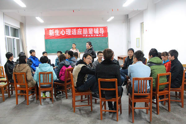 团委学生会主办、心理部承办的新生心理适应朋辈辅导活动在C区工科楼举行。张彩虹、伊金芳、刘晓洁、曹梦玉等10余名来自宁夏大学心理辅导中心的高年级同学为学院2014级新生进行心理适应朋辈辅导。