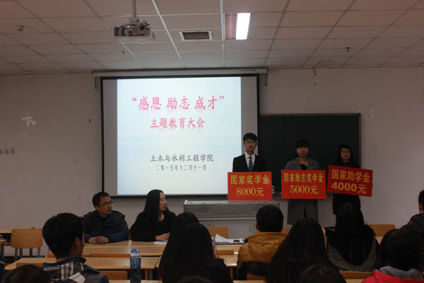 马小凤老师首先对六合彩网上投注app本年度各类奖助学金评定工作进行了简单的回顾。王娜老师宣读2015年国家奖学金、国家励志奖学金、国家助学金获得者名单。之后学生代表2014级周浩然、2013级谭一品、2015级张美洁三名同学分别代表国家奖学金、国家励志奖学金、国家助学金获得者先后做了发言,他们表达了对学校、老师辛勤培养的感谢之情,表示会努力学习回报学校、回报社会、回报国家。最后,张强副书记作了总结讲话,他从今年资助政策的变化、学院资助工作的情况两方面入手,对今年的评定工作进行了系统性的总结,对广大同学提出了要有感恩奉献意识、树立自立自强意识,增强勤俭节约意识三个方面的要求,希望同学们能更加努力学习,争取取得更好的成绩。