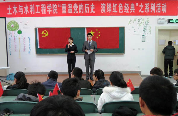 在工科楼第三阶梯教室举办了主题为“重温党的历史,演绎红色经典”的历史剧大赛。学院党总支副书记张强老师、学办主任郭利老师及全体辅导员与在场同学共同观看了此次精彩的表演,并重温了革命先烈在峥嵘岁月里为建立新中国而进行艰苦斗争的光辉历程。