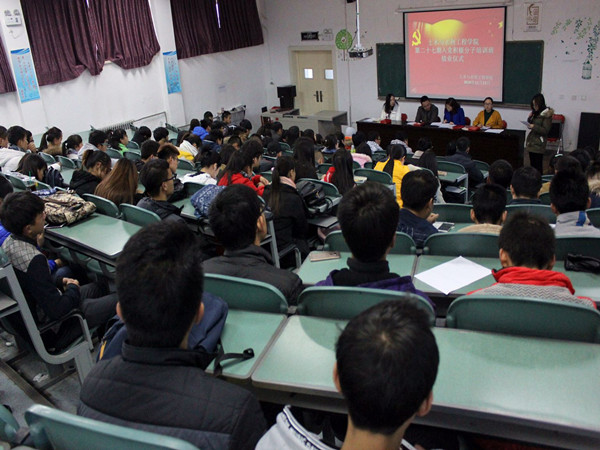 学办主任郭利主持仪式。党委副书记柳松洁、团委书记王娜、16级辅导员陶雪梅及第二十七期全体入党积极分子参加了此次仪式。整个会场秩序井然,全场气氛庄重严肃。