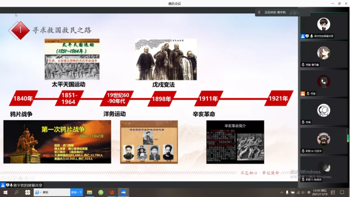 随后,蒋宇欢�1840-1921年的历史事件将我国救国救民之路娓娓道来。他强调把思想问题解决好,才能进一步解决实际问题。希望同学们能从历史中学习,把思想问题和实际问题结合起来,进一步提高解决问题的能力�