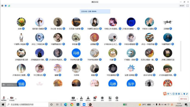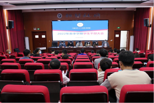 2022年4月8日中午,宁夏大学土木水利工程学院召开2022年春季学期学院学生干部大会,会议于知行楼三楼阶梯教室及线上同时开展。学院党委副书记苏宇静、20级本科生辅导员何涛、研究生辅导员徐浩、19级本科生辅导员梁冀宁、21级本科生辅导员吴璞伟、各班班长、团支书、学习委员、学生党支部委员、团委、学生会、易班工作站各级负责学生参与本次会议,学生工作办公室主任王娜主持本次会议。