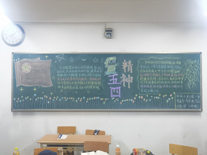 21级各班级积极围绕“弘扬五四精神”主题,齐心协力,对黑板报进行精心设计。一幅幅精美绝伦的黑板报作品,汇集了各班学生的集体智慧,也体现了同学们爱党爱国的热情。