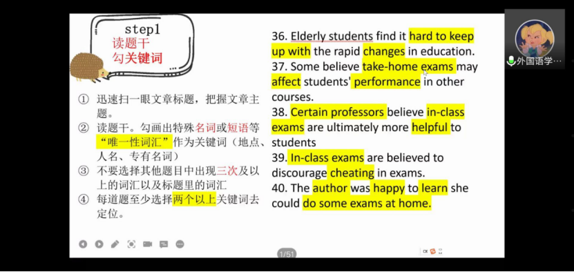 会议开始后,由负责讲解的同学为同学们介绍了选词填空,长篇阅读等在四六级中出现的常见题型。几位讲解的同学有自己独特的讲解方式,风趣幽默,平易近人,十分清晰地将考试时的要点及易出现的问题进行了详细的讲解。在辅导中,讲解的同学提示同学们,答题时要学会勾选关键词,教会同学们什么样的词才是有效的关键词,选出关键词后扫读文章进行匹配,这样可以节省大量的答题时间,同时提高答题的准确度。