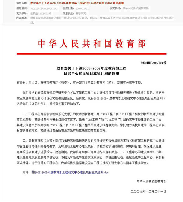 2008-2009年度教育部工程研究中心建设项目立项计�
