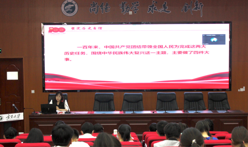 王娜带领同学们总结党的百年历史,从中国共产党成立100年来带领中国人民创造的四个伟大成就告诫同学们站在历史的深厚基础上要更加坚定地走向未来,以历史主动精神奋进新征程、建功新时代。以党的四次“赶考经历”为主线,阐明我党在这一百年里,赶考之心从未改变,赶考之路从未间断,和同学们一起学习了我党的赶考精神。并希望同学们学习吴金印同志一心为民的精神,做到以实现中华民族伟大复兴为己任,严于律己、对党忠诚,不断提高政治站位,强化责任担当,走好新时代赶考之路。