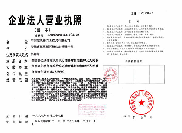 中国建筑第六工程局有限公司(简称中国建筑六局)是世界500强企业、全球最具国际竞争力的建筑地产综合企业集团——中国建筑工程总公司的骨干成员企业,是以高端房建、基础设施、房地产开发三个业务板块为主,集建筑工程设计、施工、机电设备安装、装饰和技术咨询等为一体的大型建筑综合企业集团。中国建筑六局成立于1953年,前身是由中国人民解放军20兵团后勤部和中国人民解放军建筑工程二师合并改编而成,至今已走过60年的发展历程,总部设在天津滨海新区中心城区塘沽杭州道72号。