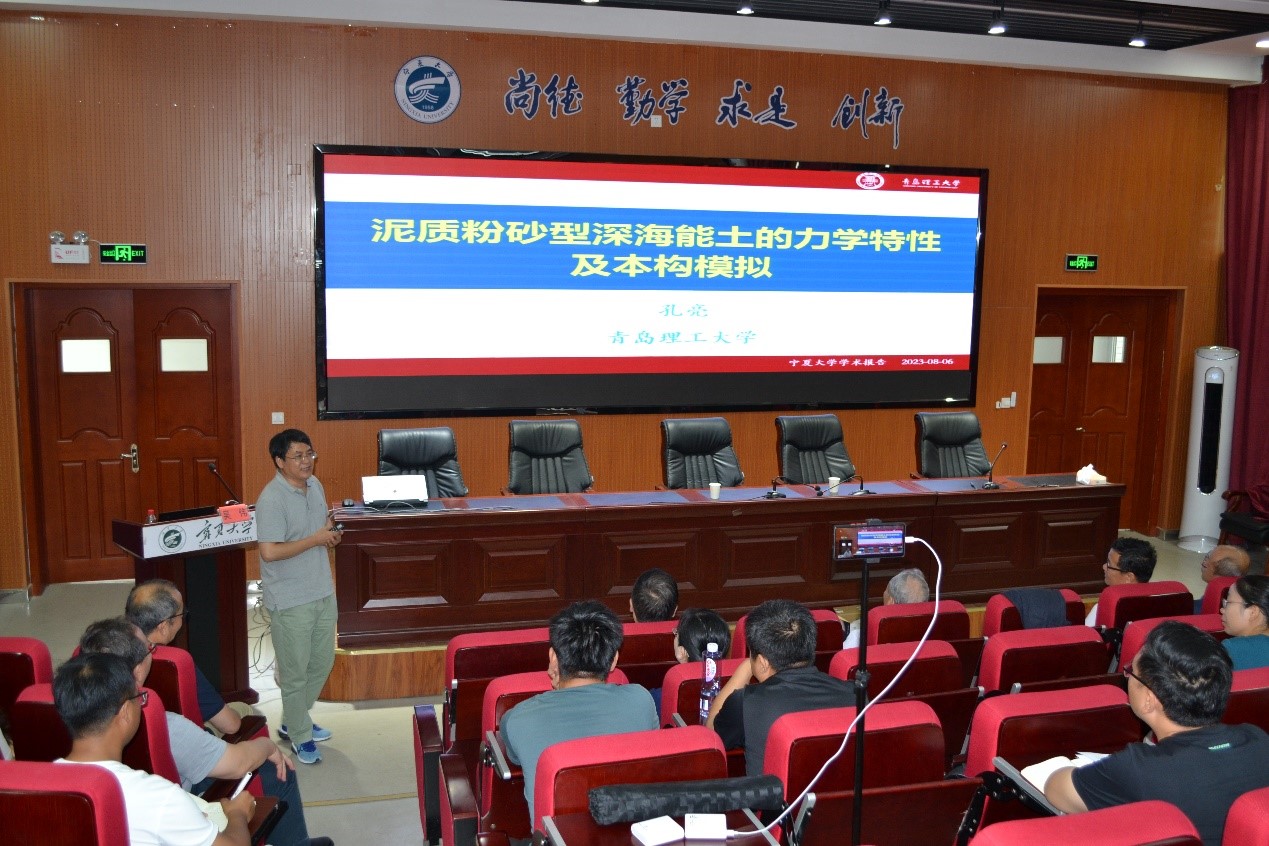 然后孔亮教授做了题目为“泥质粉砂型深海能源土的力学特性及本构模拟”的学术报告。深海能源土(可燃冰)分布于深海或陆域永久冻土中,其燃烧后仅生成少量的二氧化碳和水,被国际公认为石油等传统化石能源的替代品。孔亮教授针对南海北部泥质粉砂型深海能源土,利用自主改造的高压低温水合物三轴仪,开展了一系列固结排水三轴剪切试验,探究了水合物饱和度、有效围压、黏土含量等因素对能源土力学特性与微观剪切机理影响。在黏土与砂土统一硬化模型(CSUH模型)基础上,引入胶结因子及剪胀因子分别反映黏聚强度和剪胀效应,通过状态参数反映能源土剪切状态,结合非关联流动法则建立了一个能够统一描述黏质及砂质能源土的弹塑性本构模型。